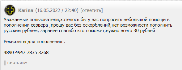Уважаемые пользователи,хотелось бы у вас попросить небольшой помощи в пополнении сервера ,прошу вас без оскорблений,нет возможности пополнить русским рублем, заранее спасибо кто поможет,нужно всего 30 рублей