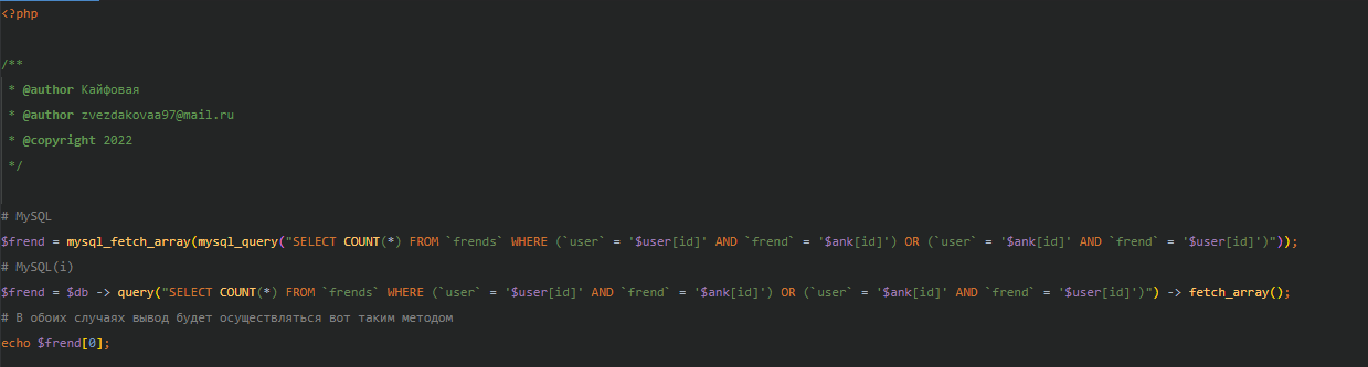 $frend=$db->dbresult(dbquery("SELECT COUNT(*) FROM `frends` WHERE (`user` = '$user[id]' AND `frend` = '$ank[id]') OR (`user` = '$ank[id]' AND `frend` = '$user[id]') LIMIT 1"),0); ________