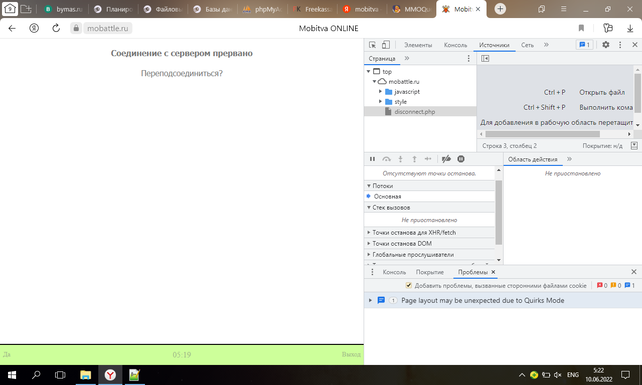 всем доброго дня суток! люди нужна ваша помощь. вот смотрите. я занимаюсь одной игрой мобитвой и мне нужна ваша помощь по закрытию кода . ну тоесть, к примеру когда заходим в игру и жмем к примеру иследовать элемент и чтоб код игры закрывался или вел на дисконект . а я пробывал в двух битвах каторые щас активные игры и в одной там кроме индекса. стилей и картинок не че не откроешь и не скопируешь, а в другой мобитве при иследования элемента просто закрываеться соединение в disconnect.php! если кто знает то подскажите пжл как так сделать так же приложу скриншеты
