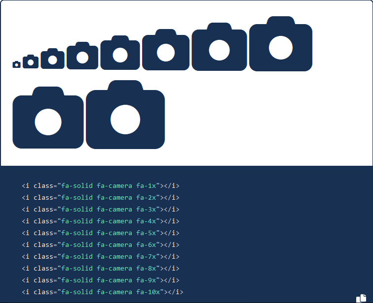 <?php # Вот это подключаешь в шапку echo'<script src="https://kit.fontawesome.com/9272104ef5.js" crossorigin="anonymous"></script>'; # Ну а вот так вот пользуешься echo' <i class="fa-solid fa-camera fa-1x"></i> <i class="fa-solid fa-camera fa-2x"></i> <i class="fa-solid fa-camera fa-3x"></i> <i class="fa-solid fa-camera fa-4x"></i> <i class="fa-solid fa-camera fa-5x"></i> <i class="fa-solid fa-camera fa-6x"></i> <i class="fa-solid fa-camera fa-7x"></i> <i class="fa-solid fa-camera fa-8x"></i> <i class="fa-solid fa-camera fa-9x"></i> <i class="fa-solid fa-camera fa-10x"></i> '; # Ниже креплю скриншот и соответственно ссылку на сам сайт ------