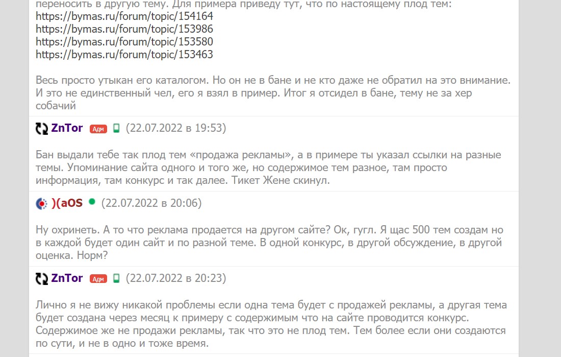 https://bym.guru/forum/topic/154360 закрыл тему, выписал бан. Якобы за плод тем. Только я этого не понимаю. В теме идет продажа рекламы на конкретном сайте. Ранее по продаже рекламы на нем тем не создавалась. В бан чате я писал об этом и приводил примеры однотипных тем, но он проигнорил. Их не банят и не закрывают. А тут прилетело за секунды. Пришлось все переносить в другую тему. Для примера приведу тут, что по настоящему плод тем: