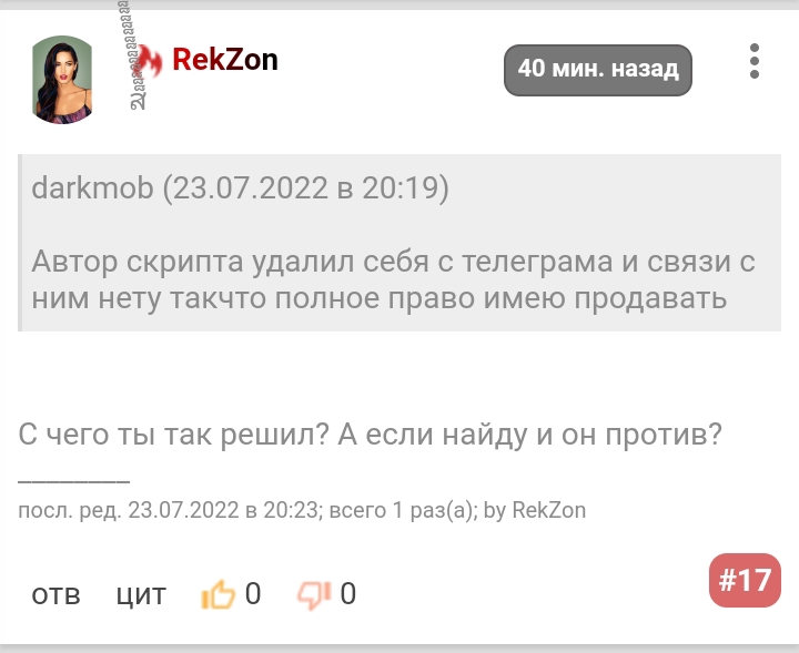 Не резонно ставить его на доску так и тебя хотят поставить, почему, а потому что рекзона хочет, что бы его копия скрипта не была ещё у кого то, а ты хочешь получить ещё денег или не хочешь заниматься просто и поэтому продаёшь. Хотя от автора скрипта не было ни слова о перепродажи и так же ни слова о том что нельзя продавать.