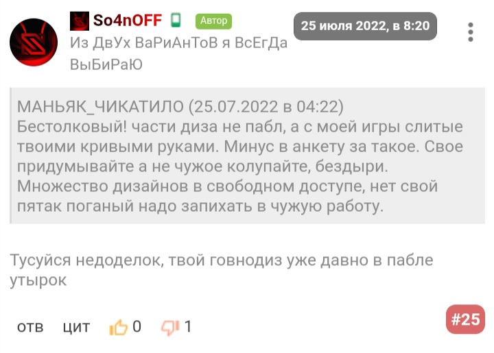 Да раз на то пошло, этот тугодум мог мне в лс написать, мол кореш понравился дизайн твой, можно я типа пару дивов возьму. Я бы может и дал добро. Но на мое засечаение обоснованное посыпались угрозы и слитии игры в пабл. Вот такие дела.