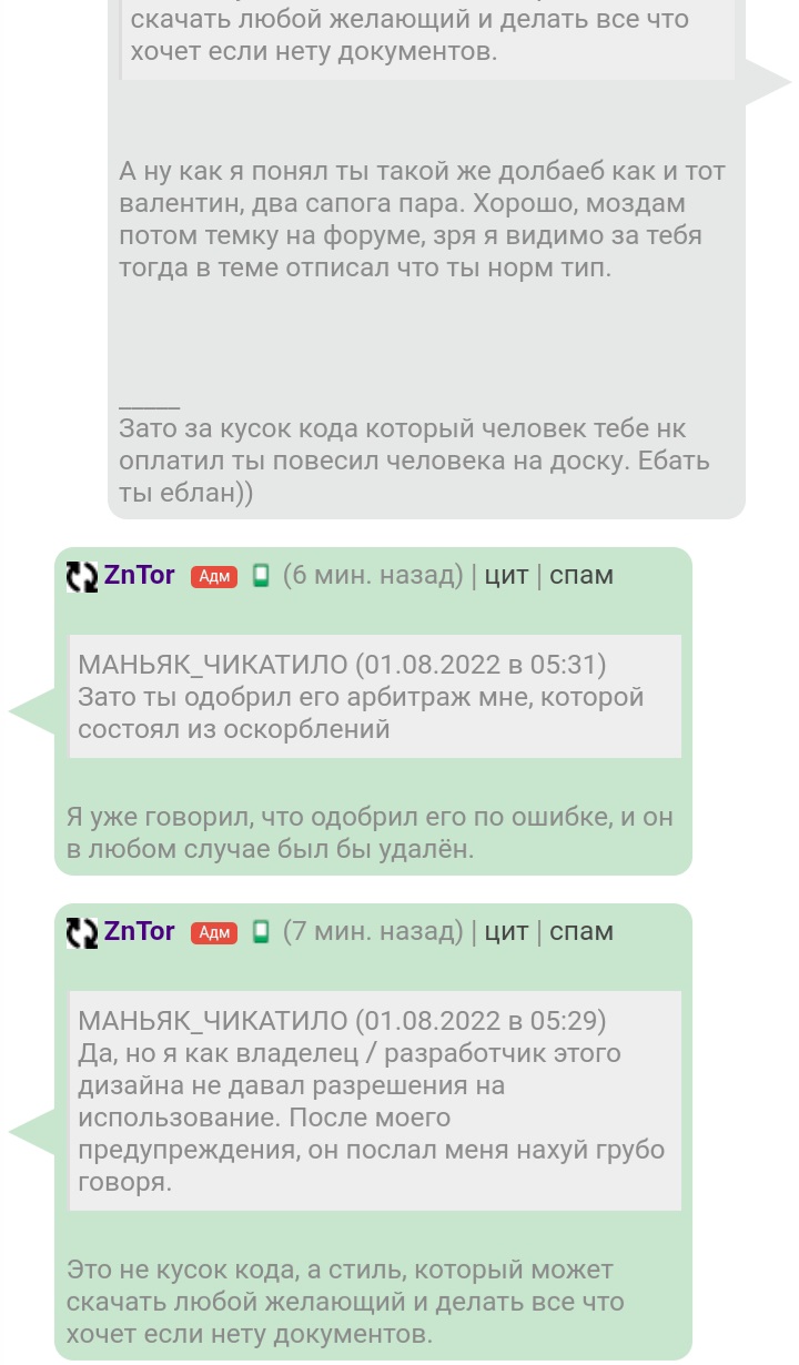 То есть когда человек с хостинга ворует скрипт, и выкладывает в пабл, ему вешают мошенника. Но когда человек тоже самое делает с дизайном, его выгораживают дружки админы. В данном случае ZnTor. Прикреплю скриншот что он пробормотал на мою претензию.