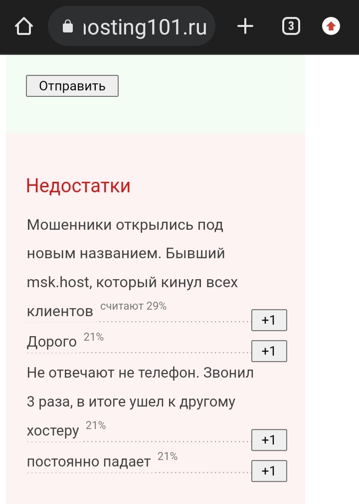 Интересная особенность hosting101 в виде отсутствия модерации отзывов. К тому же об этом говорит ровно один отзыв. Если Вы не имеете к нему никакого отношения, то почему больше половины отзывов говорит об обратном?)