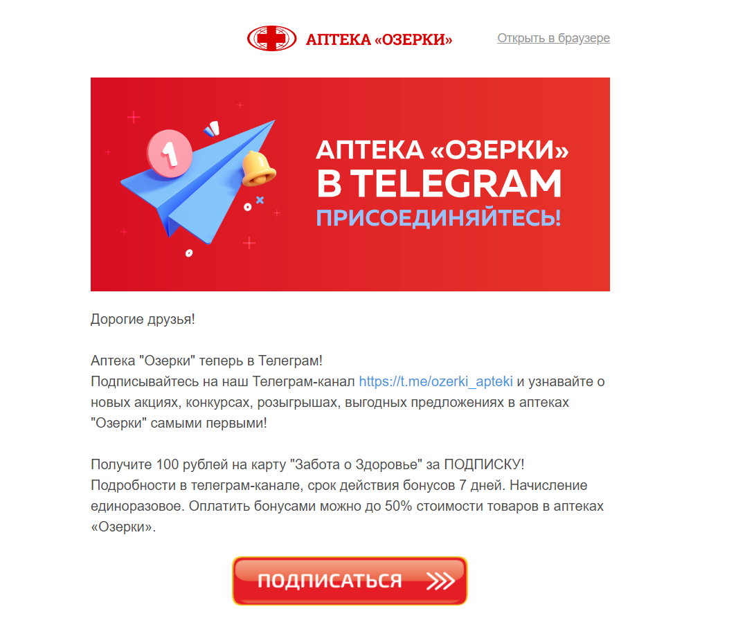 Пришло письмо от аптеки "Озерки" с предложением подписаться на их телеграм. Как оказалось такого канала нет. Не долго думая зарегистрировал его себе. И сейчас уже 60 подписчиков. И это спустя 15 минут после получения письма. Что посоветуете с ним сделать дальше?