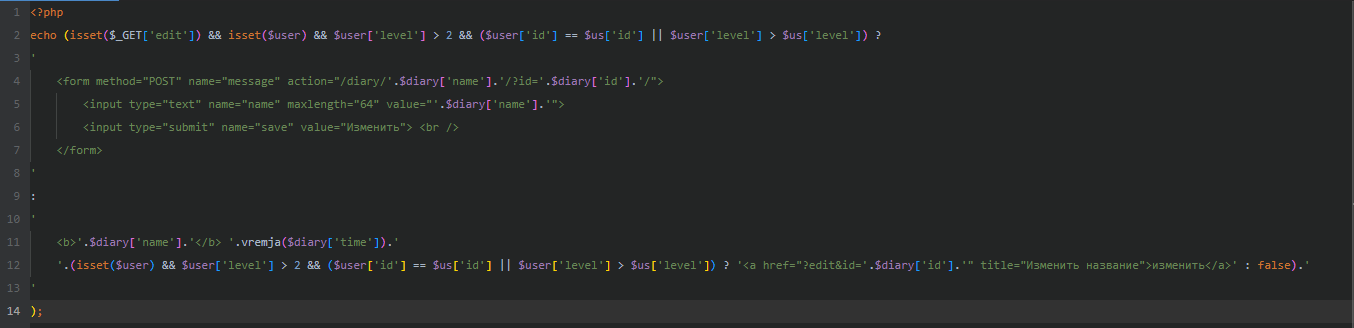 if(isset($_GET['edit']) && $_GET['edit']=='name' && isset($user) && $user['level']>2 && ($user['id']==$us['id'] || $user['level']>$us['level'])) { echo'<form method="post" name="message" action="/diary/'.$diary['name'].'/?id='.$diary['id'].'/ ">'; echo'<input name="name" type="text" maxlength="64" value="'.$diary['name'].'">'; echo'<input type="submit" name="save" value="Изменить"><br />'; echo'</form>'; } else { echo'<b>'.$diary['name'].'</b>'; echo ''.vremja($diary['time']).''; if(isset($user) && $user['level']>2 && ($user['id']==$us['id'] || $user['level']>$us['level']))echo'<a href="?edit=name?id='.$diary['id'].'" title="Изменить название">изменить</a>'; } ________