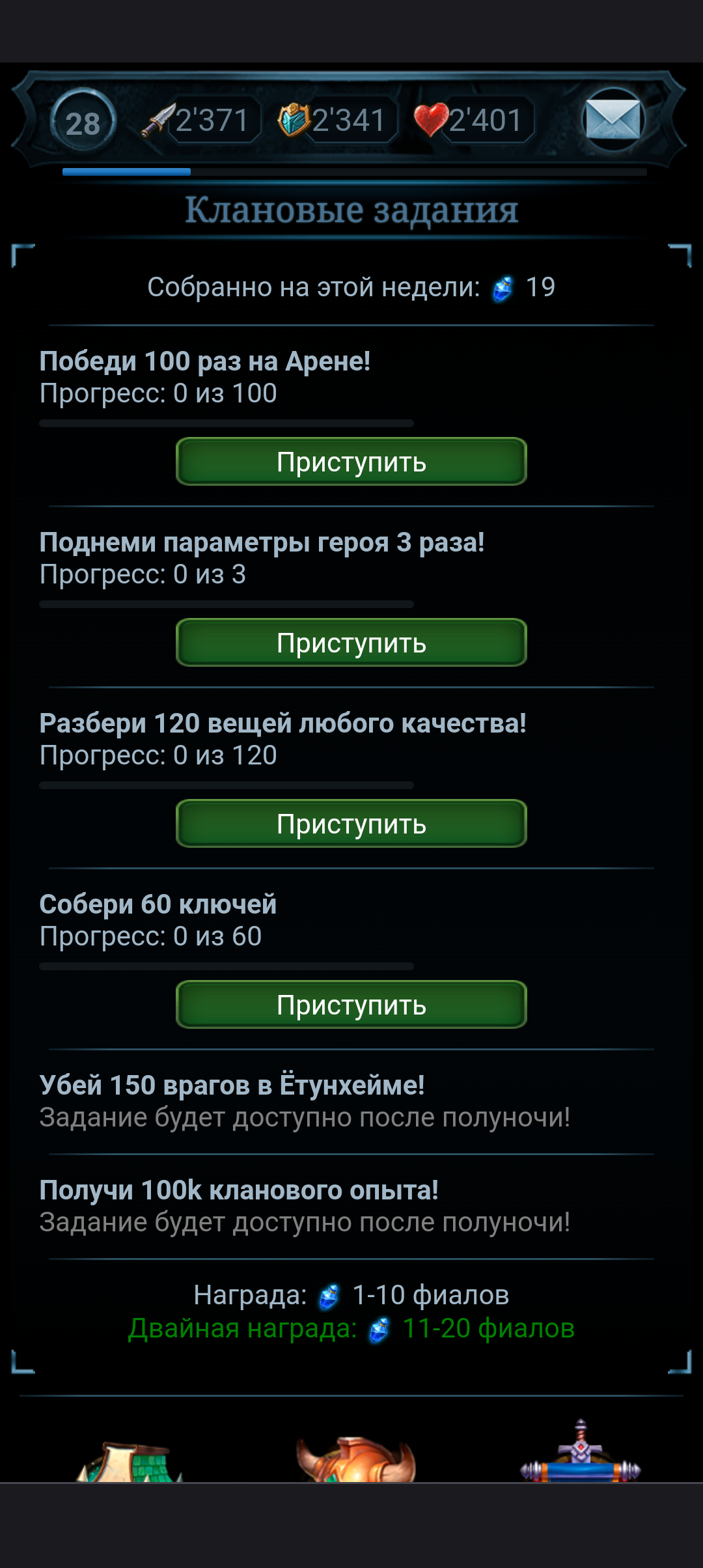 Так же как и с турниром по ключам, в конце недели будет подводиться итог турнира! Кланы принимавшие участие в турнире получат по 2 золота за 1 фиал!