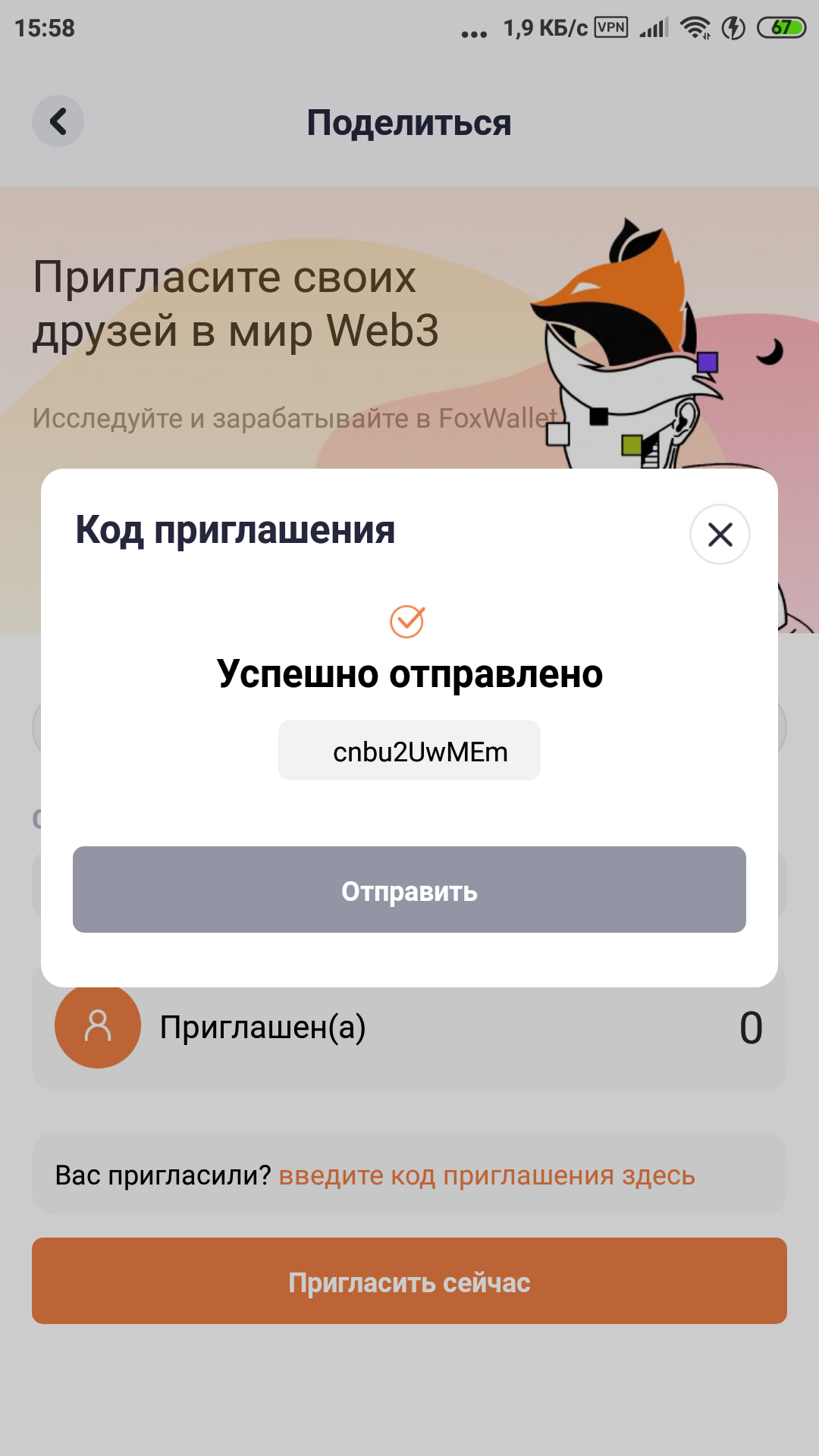 Если при регистрации ошибка с пригласительным кодом, жмем поделиться и вводим там его там.