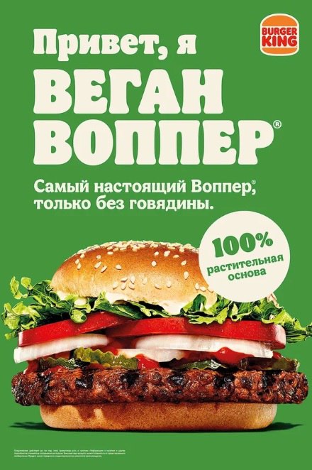 «Бургер Кинг» начал продавать бургеры с котлетой из растительного мяса от производителя майонеза «Слобода». «Веган Воппер» готовится с использованием веганского майонеза и пока продается только в ресторанах Москвы и Петербурга.