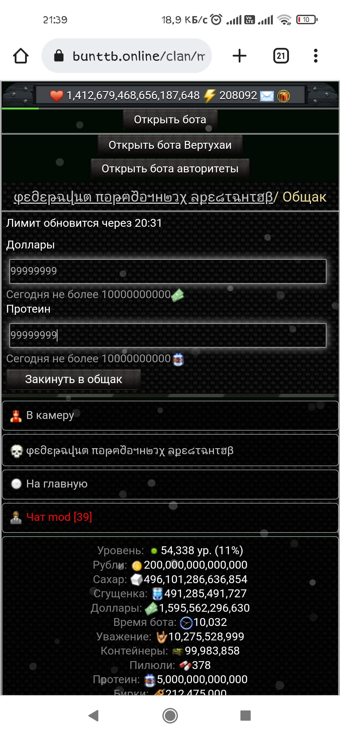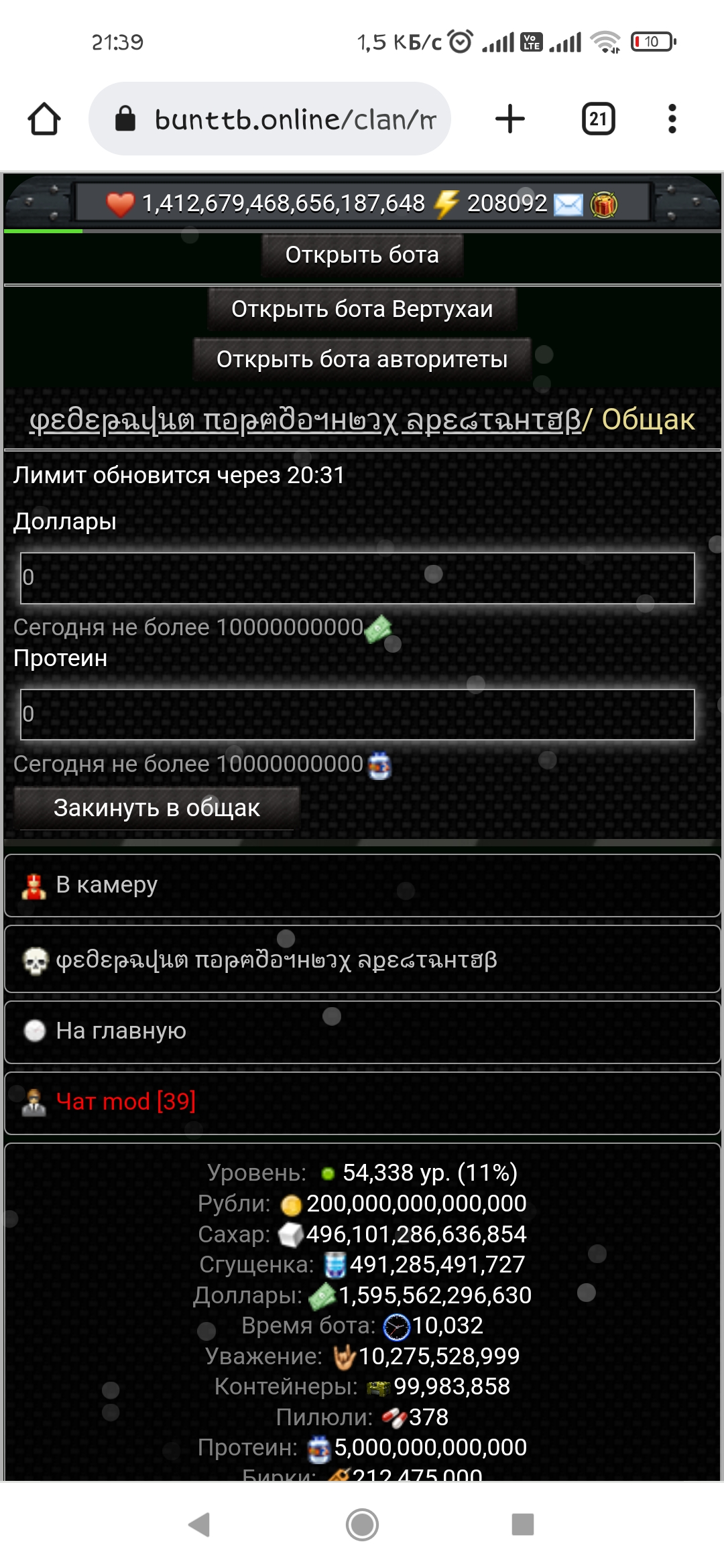 Всем привет! Не могу понять поставил в клане лимит пополнения общака. Щас покажу скрин. А пополнить его можно всего ничего. В базе в самом файле все кланов сделал в сьатистике все бигинг 255. И всеравно не в какую. Не могу понять где еще находится это чтобы лимит пополнения соответствовал.