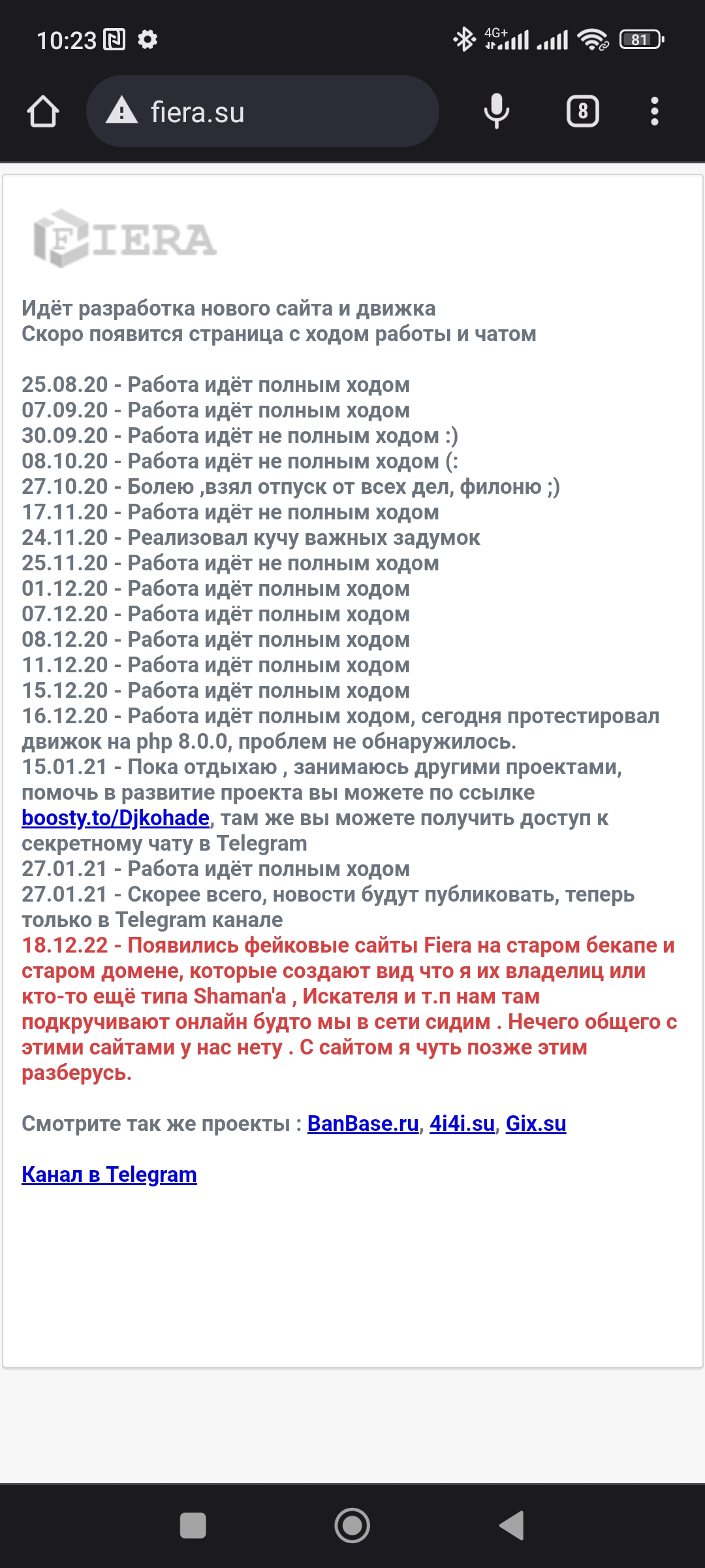 18.12.22 - Появились фейковые сайты Fiera на старом бекапе и старом домене, которые создают вид что я их владелиц или кто-то ещё типа Shaman'а , Искателя и т.п нам там подкручивают онлайн будто мы в сети сидим . Нечего общего с этими сайтами у нас нету . С сайтом я чуть позже этим разберусь.