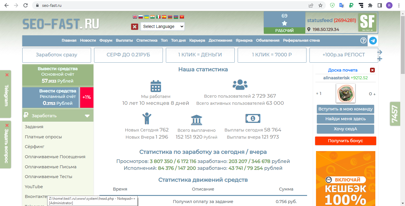 я еще зарабативаю на SeO-FasT.Ru