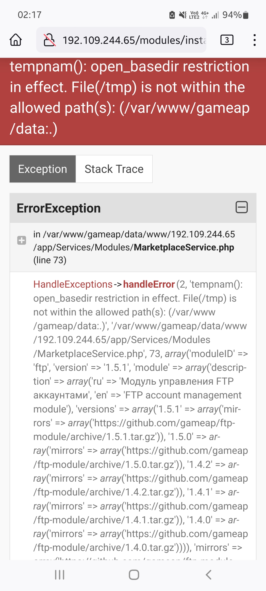 А так, отключил open_basedir, ошибка осталась