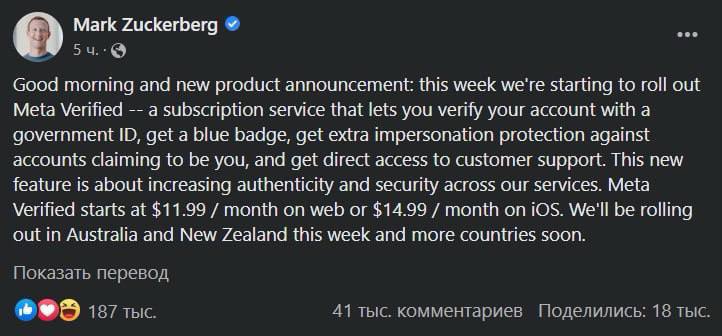 Глава Meta Марк Цукерберг объявил о запуске услуги Meta Verified - платной верификации для пользователей соцсетей Facebook и Instagram, которая позволит получить синюю галочку рядом с именем пользователя, а также доступ к другим услугам.