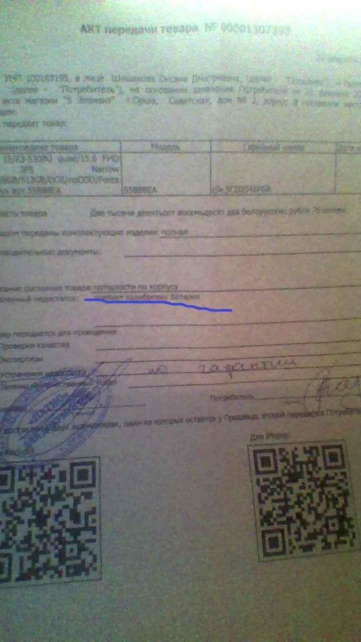 Заявленный недостаток: требует калибровку батарея (подчёркнуто)