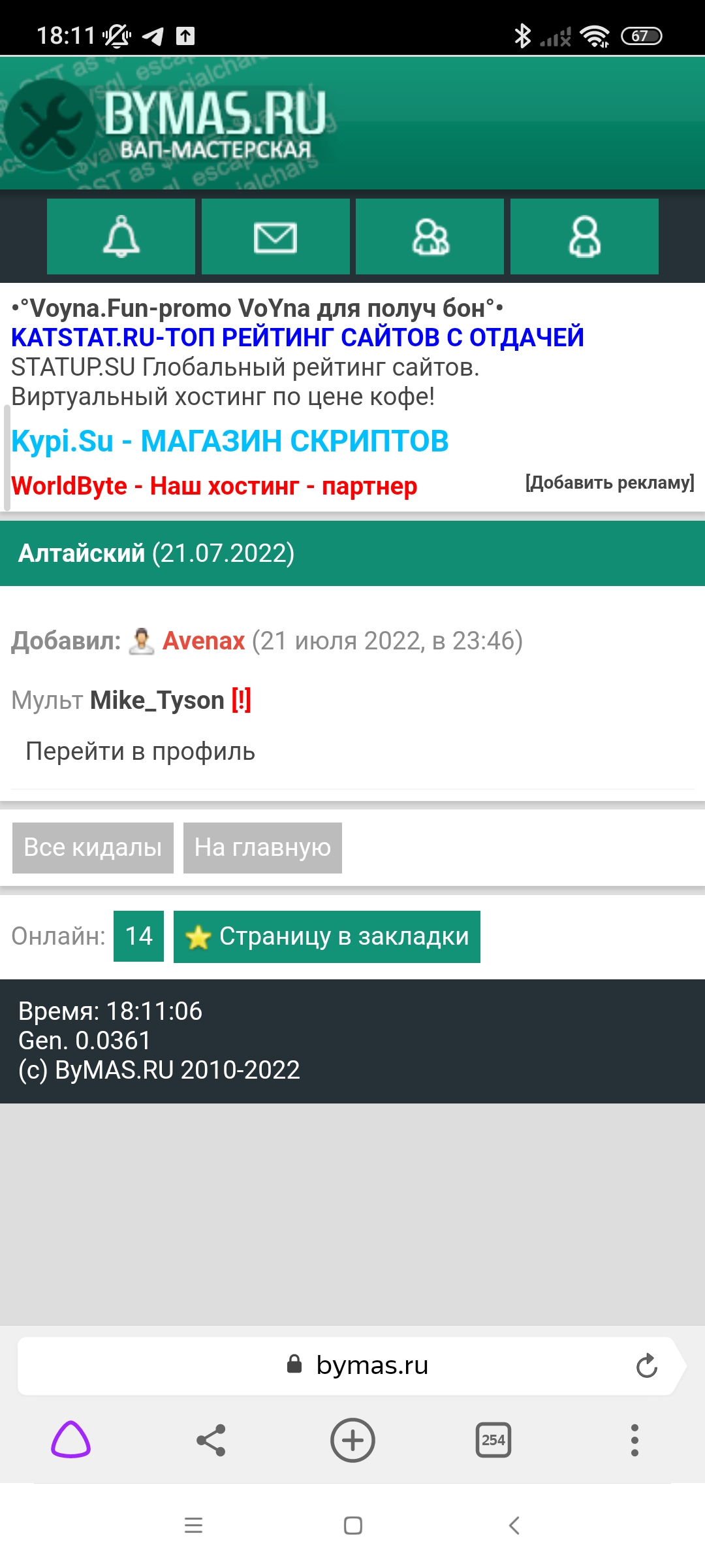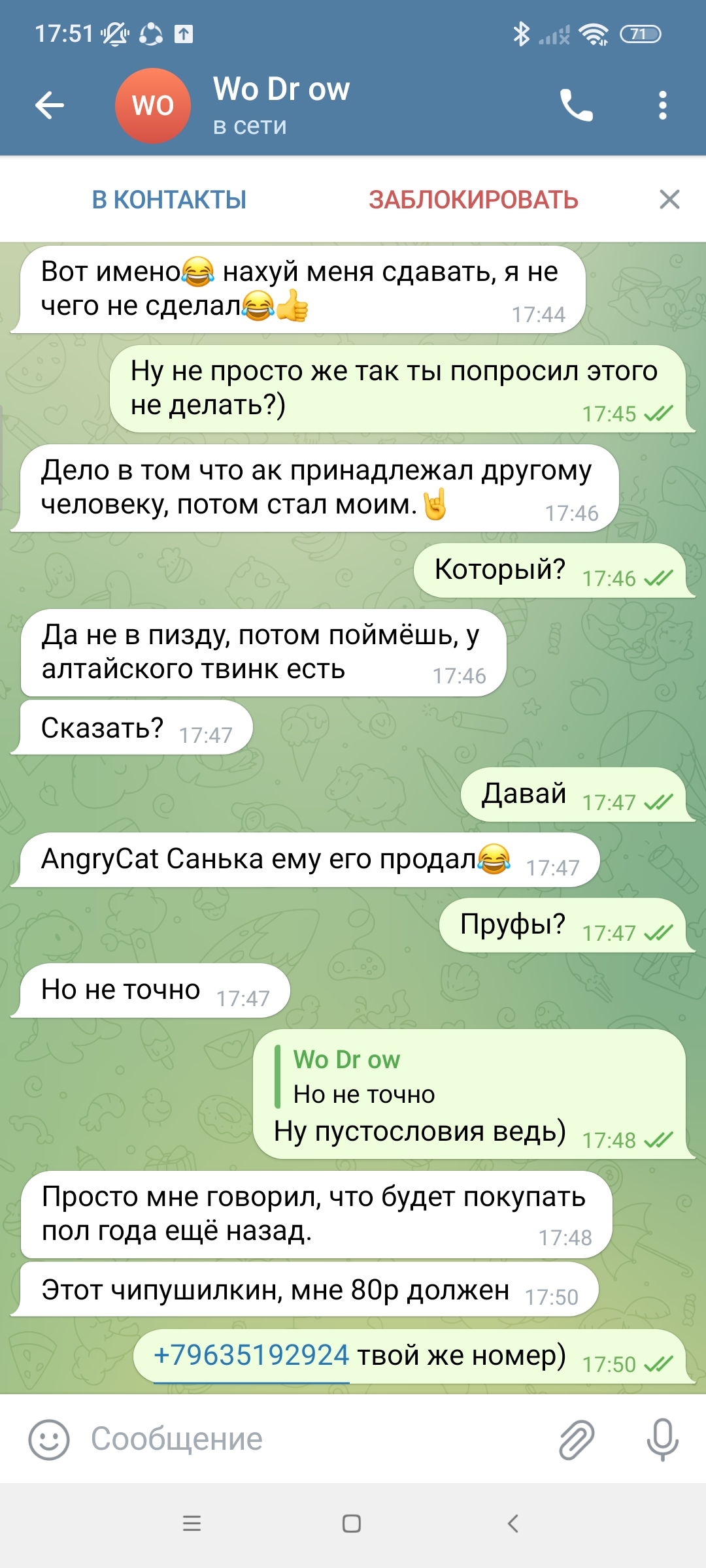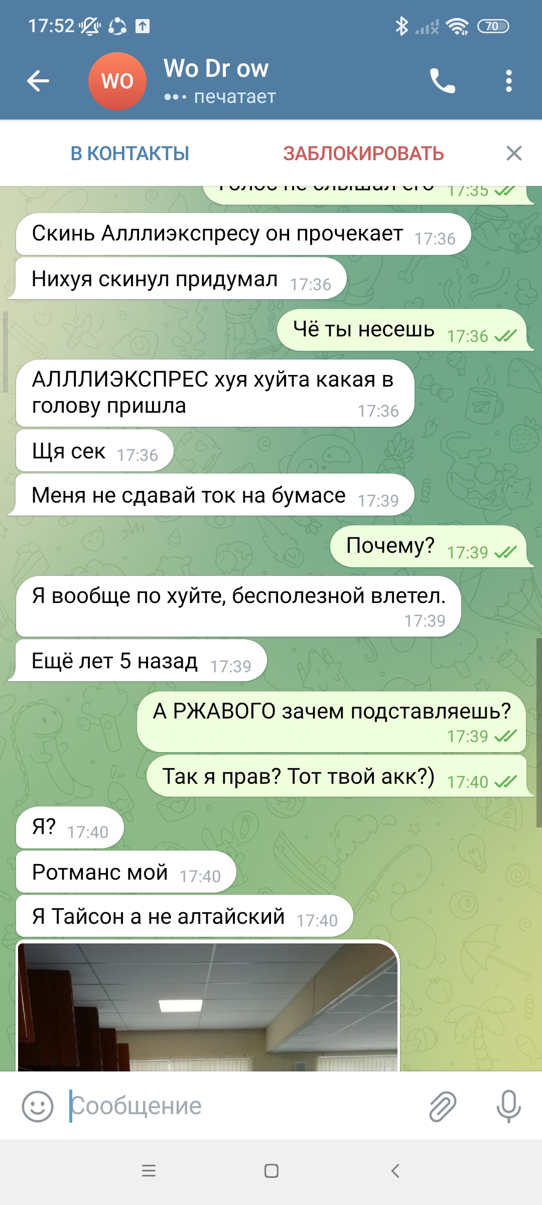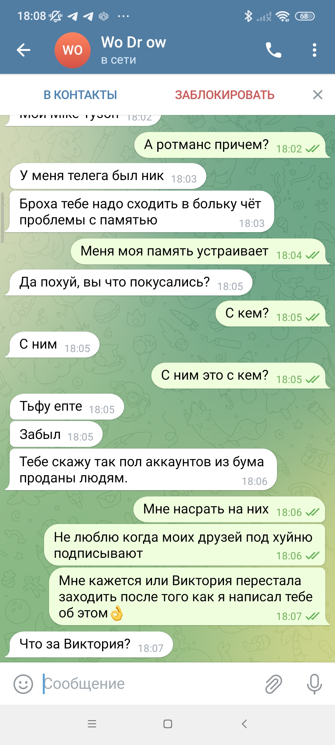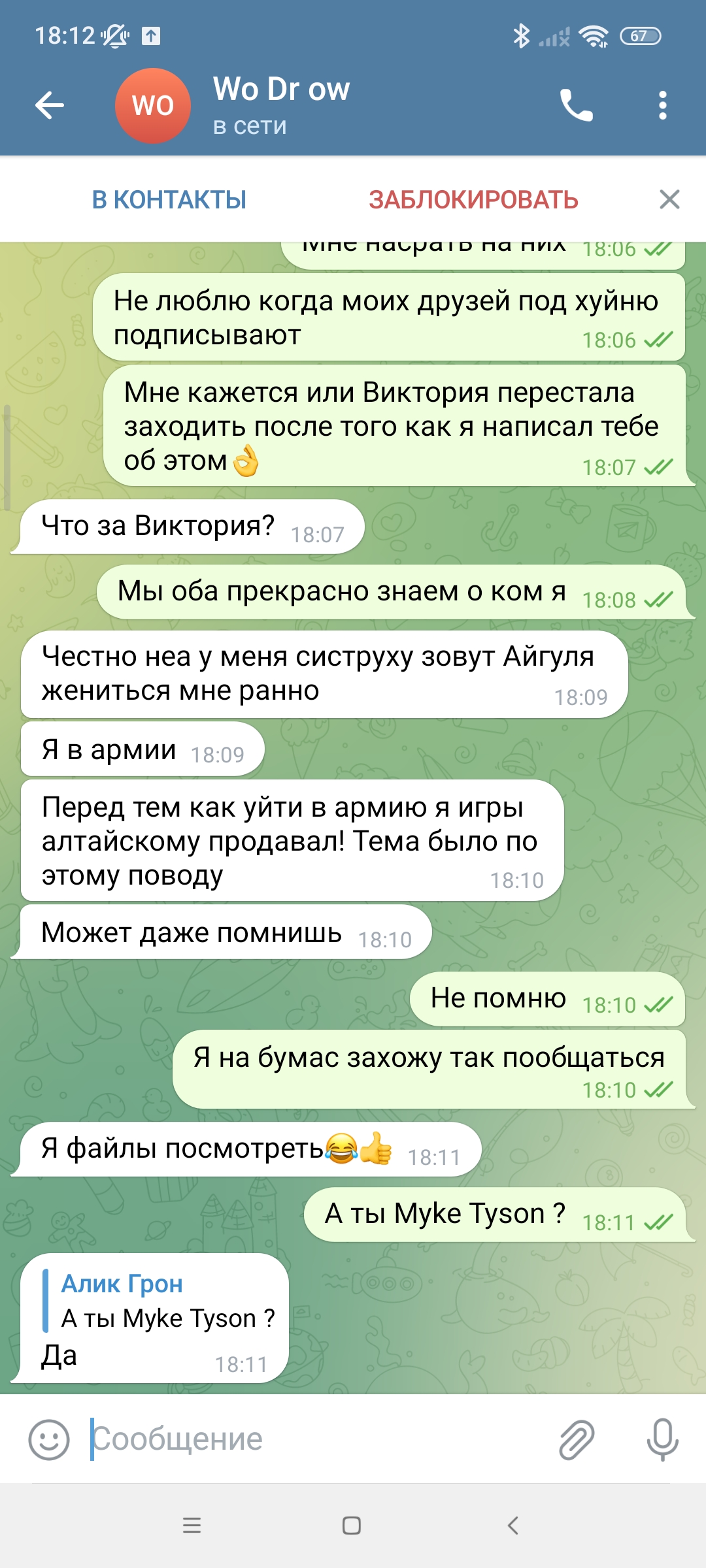 Сегодня наш форум взбудоражила тема о нашем любимом КАЗАХЕ, и я не о бывшем президенте Казахстана, тут такая тема, обещал я тому дегенерату создать аккаунт в телеге под номером Алика, я сделал, написал ему в телегу, подписан он как Виктория. Он прочёл, не ответил и вдруг мне пишет другой чувак, с ником Wo Dr ow. Он мне говорит что он Mike Tyson (кед местный), но отрицает то что он Алтайский... Ну крч все в скринах... Пока ничего не пишите, я все выложу потом начинаем срать