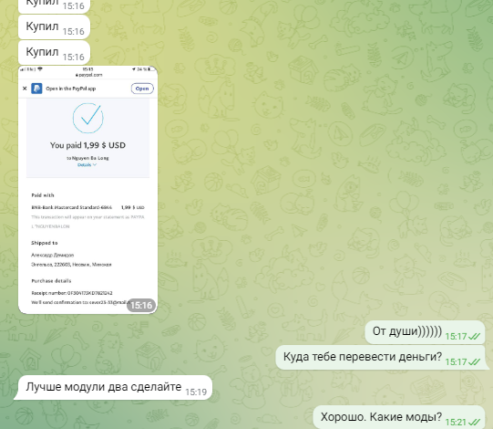 После того как он оплатит я спросил куда ему перевести деньги (которые он потратил на покупку нужного мне скрипта (2$) на что он мне ответил *Лучше модули два сделайте* я согласился но вина моя что я согласился ему сделать один из модов в этот же день (не рассчитав время выполнения заказы что был на тот момент).