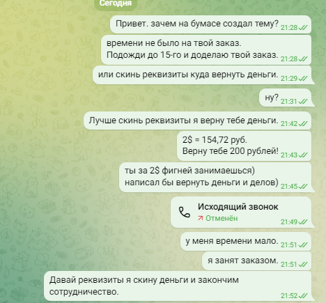 По сути с его стороны понятно возмущение по поводу жалобы но с другой стороны просьбы вернуть средства не было и поэтому я отложил его заказ.