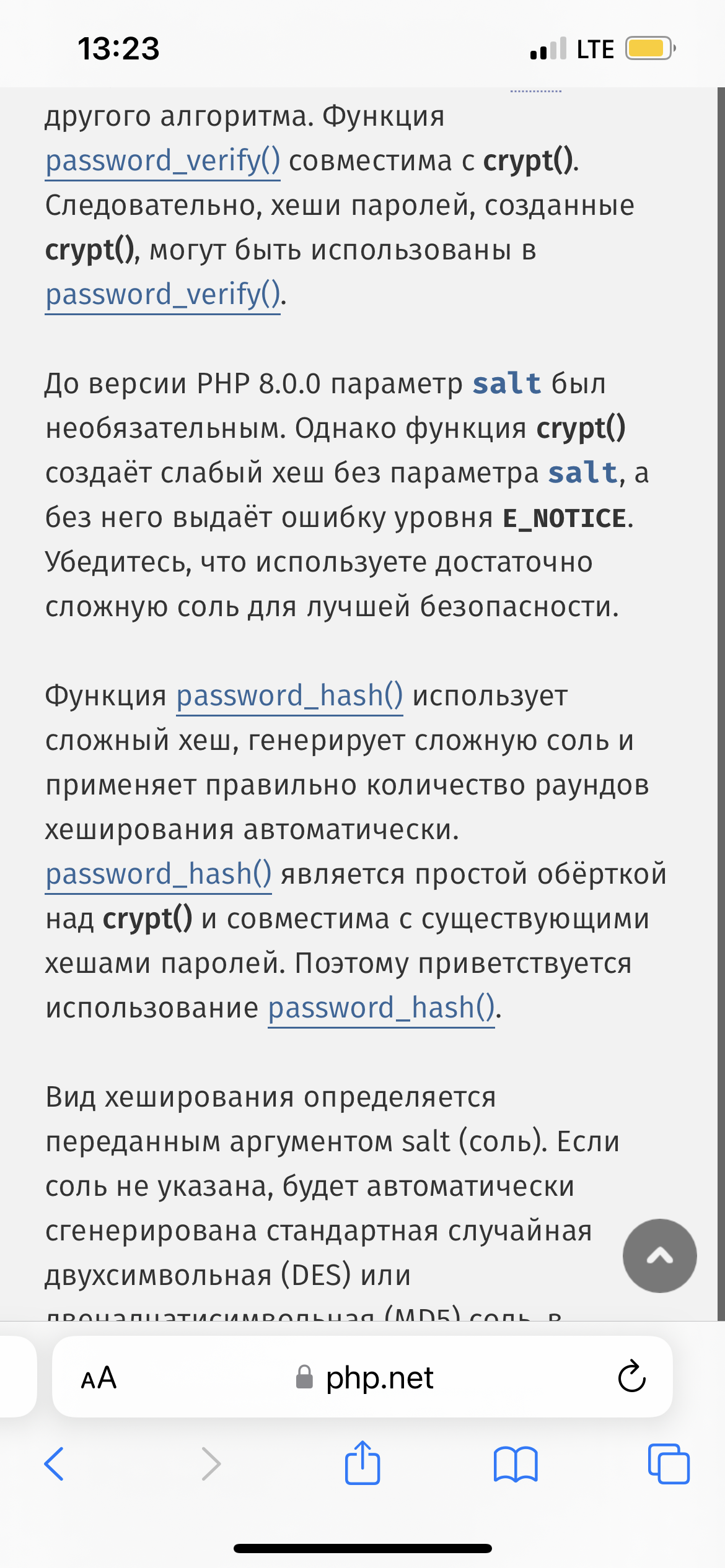 <?php // Генерируем соль для CRYPT_BLOWFISH function generate_blowfish_salt($cost = 10) { $characters = 'abcdefghijklmnopqrstuvwxyzABCDEFGHIJKLMNOPQRSTUVWXYZ0123456789./'; $salt = sprintf('$2a$%02d$', $cost); for ($i = 0; $i < 22; $i++) { $salt .= $characters[mt_rand(0, 63)]; } return $salt; } // строка для хэширования $string = 'password123'; // Генерируем соль $salt = generate_blowfish_salt(); // Хэшируем строку с помощью CRYPT_BLOWFISH $hashed_string = crypt($string, $salt); // Выводим результат echo "Строка: " . $string . "<br>"; echo "Соль: " . $salt . "<br>"; echo "Хэш: " . $hashed_string . "<br>"; ?> Если всё это для хранения паролей, то в php уже есть встроенные функции password_hash password_verify и соль автоматически генерируется