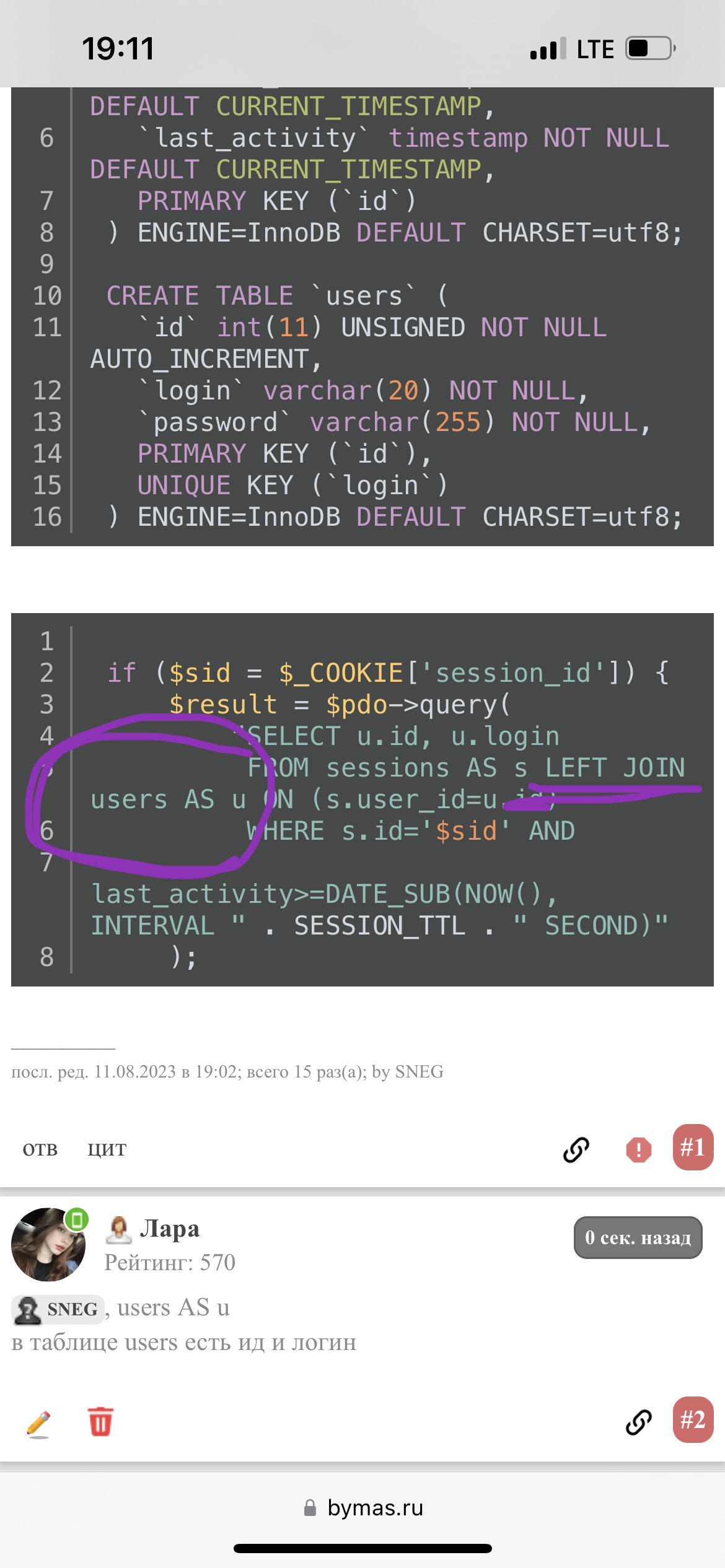 if ($sid = $_COOKIE['session_id']) { $result = $pdo->query( "SELECT u.id, u.login FROM sessions AS s LEFT JOIN users AS u ON (s.user_id=u.id) WHERE s.id='$sid' AND last_activity>=DATE_SUB(NOW(), INTERVAL " . SESSION_TTL . " SECOND)" ); ________