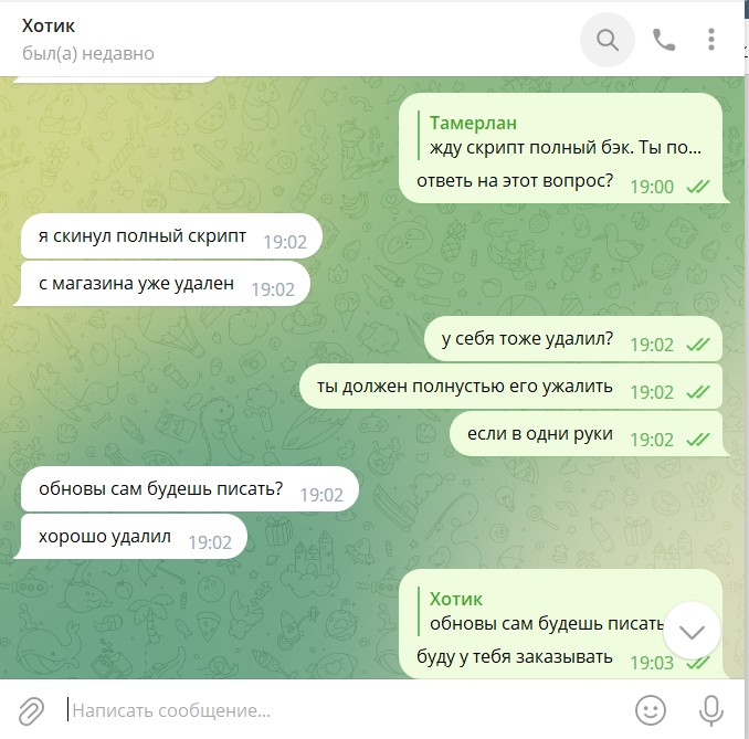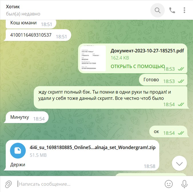 Далее до покупки договорились чтоб он убрал с магазина и чтоб в дальнейшем он его не продавал – но был договор что скрипт он у себя сохраняет чтоб мне дописать модули итд (только для этого). Скрины telegram об этом разговоре будут ниже!