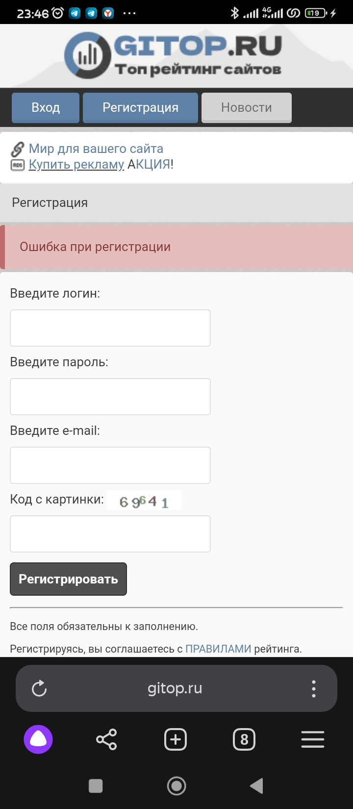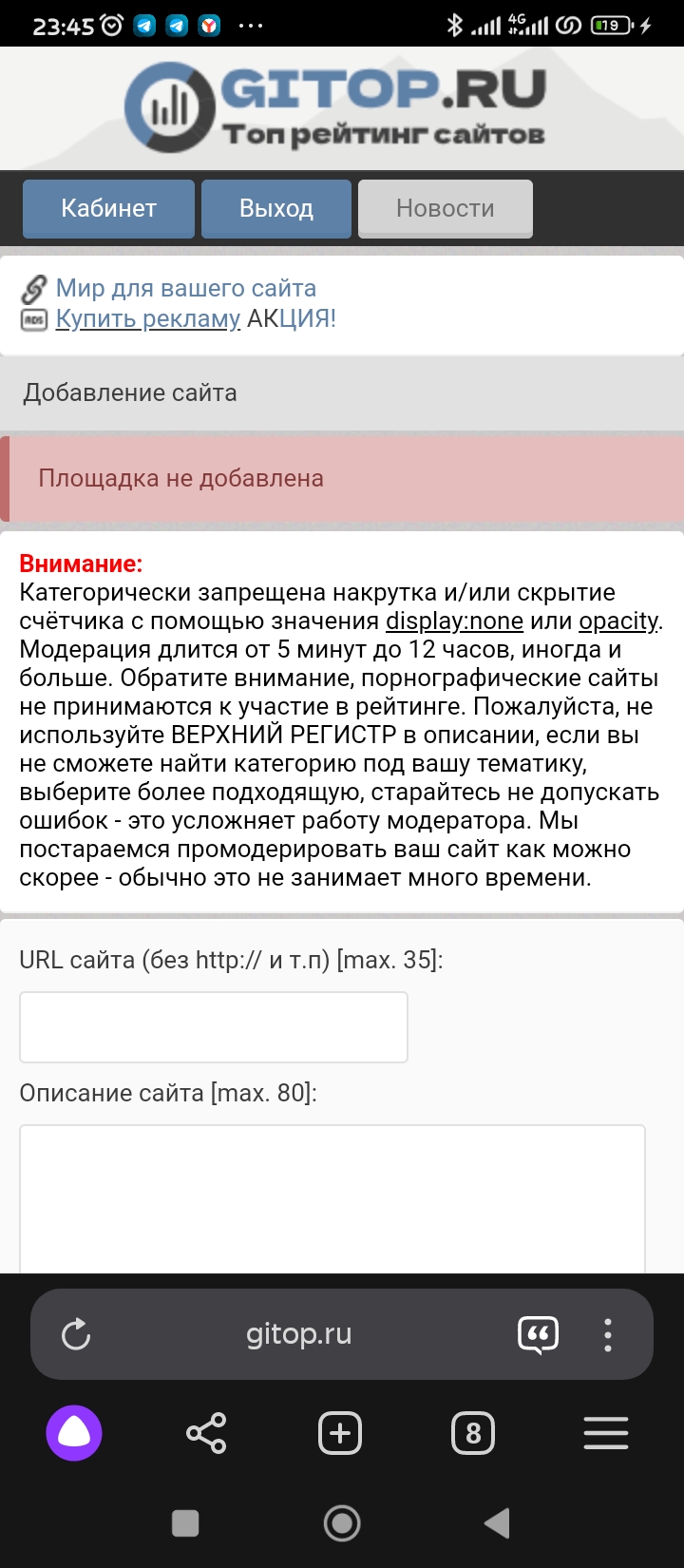 Выдает ошибку при регистрации, добавления сайта