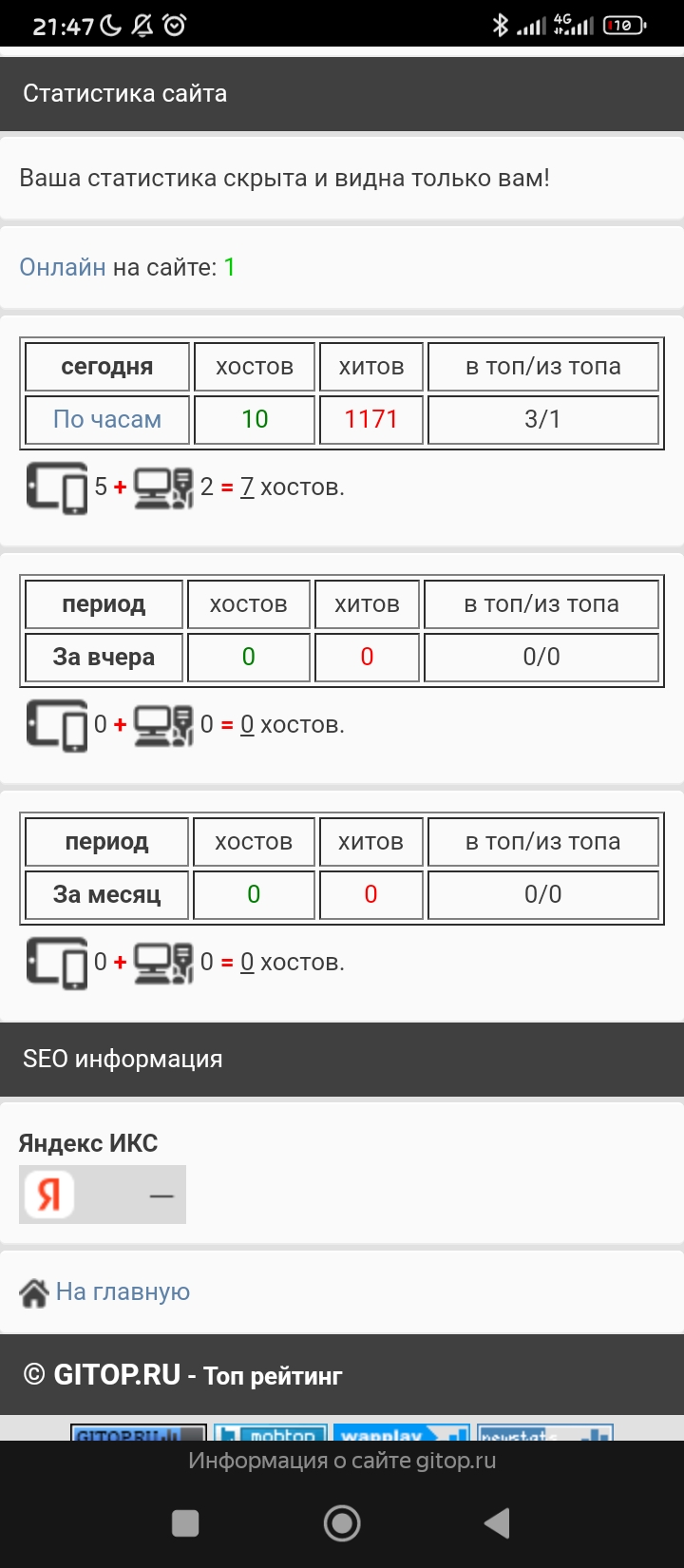 <?php define('GITOP', 1); $title = 'Статистика'; require_once ('system/connect.php'); require_once ('system/core.php'); require_once ('system/function.php'); require_once ('head.php'); $plaforms_moder = mysql_num_rows(mysql_query("SELECT * FROM `sait` WHERE `status` = '0' AND `ban` = '0'")); $plaforms_ban = mysql_num_rows(mysql_query("SELECT * FROM `sait` WHERE `ban` = '1'")); $plaforms_all = mysql_num_rows(mysql_query("SELECT * FROM `sait`")); $users_all = mysql_num_rows(mysql_query("SELECT * FROM `users`")); $cat_all = mysql_num_rows(mysql_query("SELECT * FROM `cat`")); $saits = mysql_query("SELECT * FROM `sait` ORDER BY `id`"); while($sait = mysql_fetch_array($saits)){ $day_host = $day_host + $sait['hosts']; $day_hit = $day_hit + $sait['hits']; $yday_host = $yday_host  + $sait['hosts2']; $yday_hit = $yday_hit + $sait['hits2']; $all_host = $all_host + $sait['all_hosts']; $all_hit = $all_hit + $sait['all_hits']; $day_in = $day_in + $sait['in']; $day_out = $day_out + $sait['out']; $yday_in = $yday_in + $sait['in2']; $yday_out = $yday_out + $sait['out2']; $all_in = $all_in + $sait['all_in']; $all_out = $all_out + $sait['all_out']; } $online = mysql_num_rows(mysql_query("SELECT * FROM `sait_online`")); echo '<div class="title2">Общее</div> <div class="main">Всего пользователей: <b>'.$users_all.'</b><br/> Всего площадок: <b>'.$plaforms_all.'</b><br/> Всего категорий: <b>'.$cat_all.'</b></br> Заблокированных: <b>'.$plaforms_ban.'</b><br/> <a href="/m/online_statistic.php" title="yamus"><u>Онлайн</u></a> на всех сайтах: <a><b><font color="#00cc00">'.$online.'</font></b></a><br /></div>'; echo '<div class="orange">ЗА СЕГОДНЯ</div> <div class="main">Хостов: <b>'.$day_host.'</b><br/> Хитов: <b>'.$day_hit.'</b><br/> В топ: <b>'.$day_in.'</b><br/> Из топа: <b>'.$day_out.'</b></div> <div class="orange">ЗА ВЧЕРА</div> <div class="main">Хостов: <b>'.$yday_host.'</b><br/> Хитов: <b>'.$yday_hit.'</b><br/> В топ: <b>'.$yday_in.'</b><br/> Из топа: <b>'.$yday_out.'</b></div> <div class="orange">ЗА МЕСЯЦ</div> <div class="main">Хостов: <b>'.$all_host.'</b><br/> Хитов: <b>'.$all_hit.'</b><br/> В топ: <b>'.$all_in.'</b><br/> Из топа: <b>'.$all_out.'</b></div>'; ## $new_sait = mysql_query("SELECT * FROM `".$prefix."sait` WHERE `status` = '1' AND `ban` = '0' ORDER BY `id` DESC LIMIT 1"); $new_sait_check = mysql_num_rows($new_sait); $nsait = mysql_fetch_array($new_sait); $new = ($new_sait_check > 0)  ? '<a href = "http://'.$set['home'].'/infos.php?id='.$nsait['id'].'">'.$nsait['url'].'</a>' : 'Нет'; echo '<div class="topni"><center><b>Последний добавленный сайт: '.$new.'</b></center></div>'; ## require_once ('foot.php'); ?>