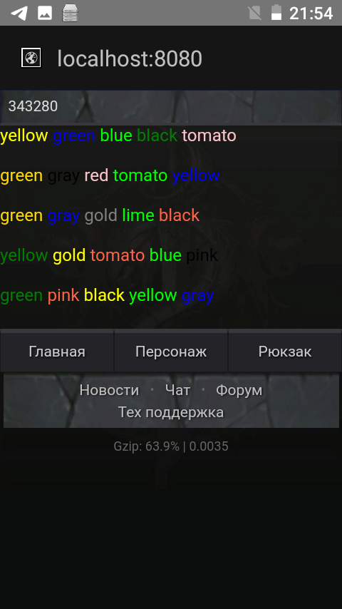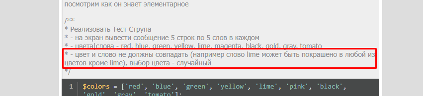 * - цвет и слово не должны совпадать (например слово lime может быть покрашено в любой из цветов кроме lime), выбор цвета - случайный