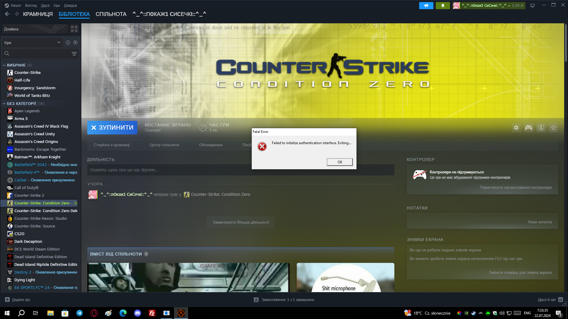 Даровки. Может кто знает, может кто подскажет, короче проблема сегодня образовалась. А именно, перестала(и) работать Counter Strike 1.6 а так же Condition Zero и Sourse ... Игра (игры) запускаются (лончеры) но потом куда не кликни - происходит КРАШ. Все варианты - STEAM-версии.. Реинсталл не помог