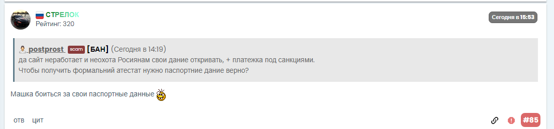 Один из администраторов заблокировал мой основной профиль мов я разжигаю конфлик илы что я там розжигаю, ребята у меня даже в мислы небыло чтото разжигать, обяснил человеку что вебмани под санкциями и Росиянам нехочу давать паспортние дание, что я такого плохого написал, никого не обозвал не послал. Я в шоке...