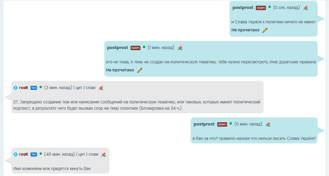 где такое правило написано, и что Слава Україні это политический контекст. Ну как бы нестиковка получается, правило нарушается самим главным админом. Хочу блокирую хочу нет, ну как бы так. И негде нет написаного что правило относится не только к сообщениям в темах