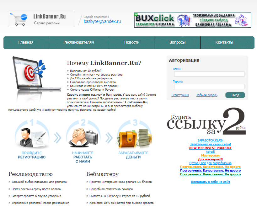 LinkBanner.Ru предоставляет автоматизированные витрины ссылок и баннеров, которые позволяют любому пользователю легко купить рекламу на вашем ресурсе!