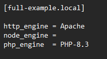 [домен/сайт ваш] http_engine = Apache (или Nginx) node_engine = php_engine = PHP-версия_ваша ------