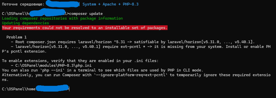 (29 нояб 2025, в 12:04)Если ты на виндовс сервере ставишь , могут быть проблемы с pcntl расширением. Если обычный Linux, установи его , после должен работать composer, если не знаешь как включаются расширения в PHP, почитай информацию.
