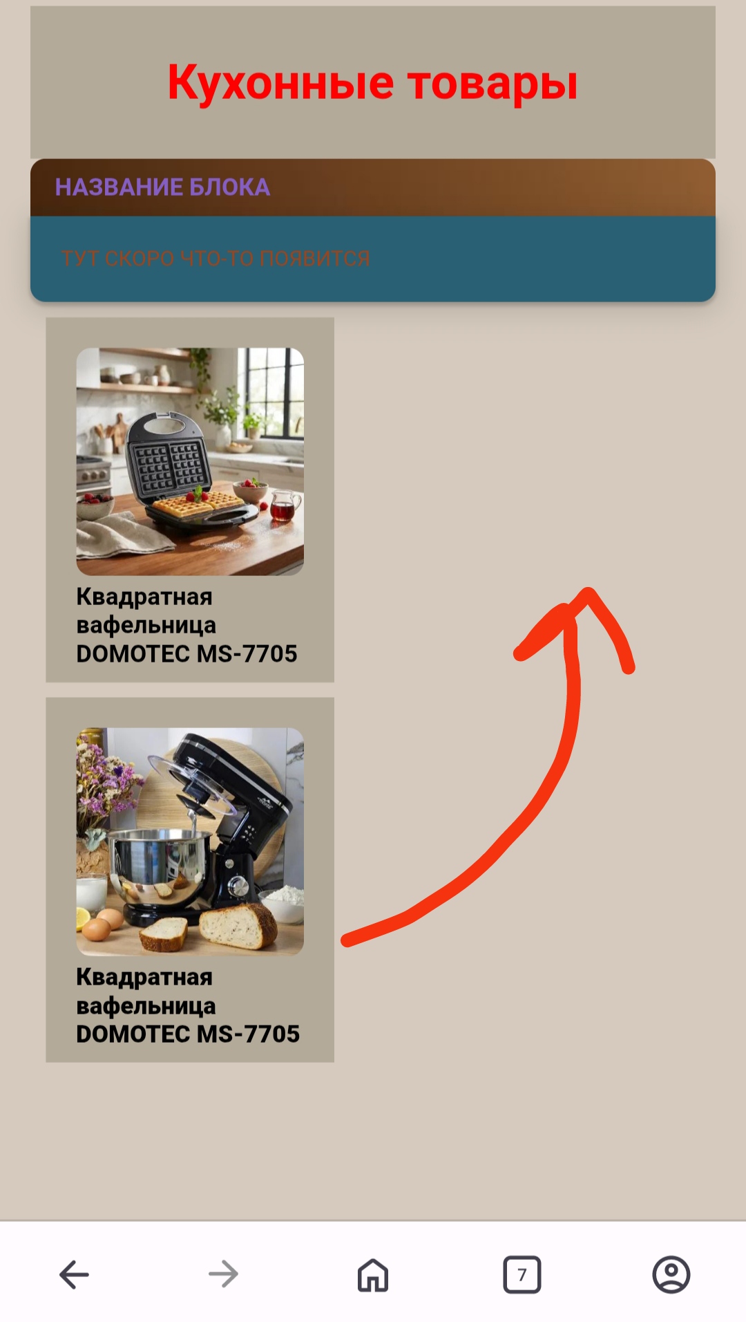 <!DOCTYPE html> <html lang="ru"> <head> <meta charset="UTF-8"> <!-- ВАЖНО: исправляет масштаб на телефоне --> <meta name="viewport" content="width=device-width, initial-scale=1.0"> <title>Кухонные товары</title> <style> * { box-sizing: border-box; } body { margin: 0; font-family: Arial, sans-serif; background: #d8cfc2; } /* Заголовок */ .title { text-align: center; color: red; margin: 15px 0; font-size: 22px; } /* Верхний блок */ .info-block { width: 90%; margin: 0 auto 25px; border-radius: 12px; overflow: hidden; } .info-title { background: #6a3d1c; color: #8a7dff; padding: 12px; font-weight: bold; font-size: 14px; } .info-text { background: #2f6c82; color: #c0c0c0; padding: 15px; font-size: 13px; } /* Контейнер товаров */ .products { display: flex; gap: 20px; padding: 0 15px; } /* Карточка товара */ .product-card { background: #bfb6a7; padding: 12px; border-radius: 16px; width: 170px; height: 260px; display: flex; flex-direction: column; } /* Заглушка */ .image-placeholder { width: 100%; height: 140px; background: #9a9a9a; border-radius: 12px; display: flex; align-items: center; justify-content: center; color: #fff; font-size: 16px; margin-bottom: 10px; } /* Название */ .product-title { font-weight: bold; font-size: 14px; margin-top: auto; /* ВЫРАВНИВАЕТ ТЕКСТ */ } /* Адаптация */ @media (max-width: 600px) { .products { justify-content: center; } } </style> </head> <body> <h1 class="title">Кухонные товары</h1> <div class="info-block"> <div class="info-title">НАЗВАНИЕ БЛОКА</div> <div class="info-text">ТУТ СКОРО ЧТО-ТО ПОЯВИТСЯ</div> </div> <div class="products"> <div class="product-card"> <div class="image-placeholder">Фото</div> <div class="product-title"> Квадратная вафельница<br> DOMOTEC MS-7705 </div> </div> <div class="product-card"> <div class="image-placeholder">Фото</div> <div class="product-title"> Квадратная вафельница<br> DOMOTEC MS-7705 </div> </div> </div> </body> </html> Всем привет