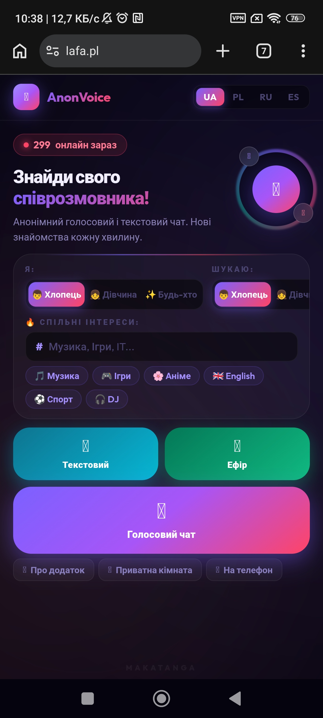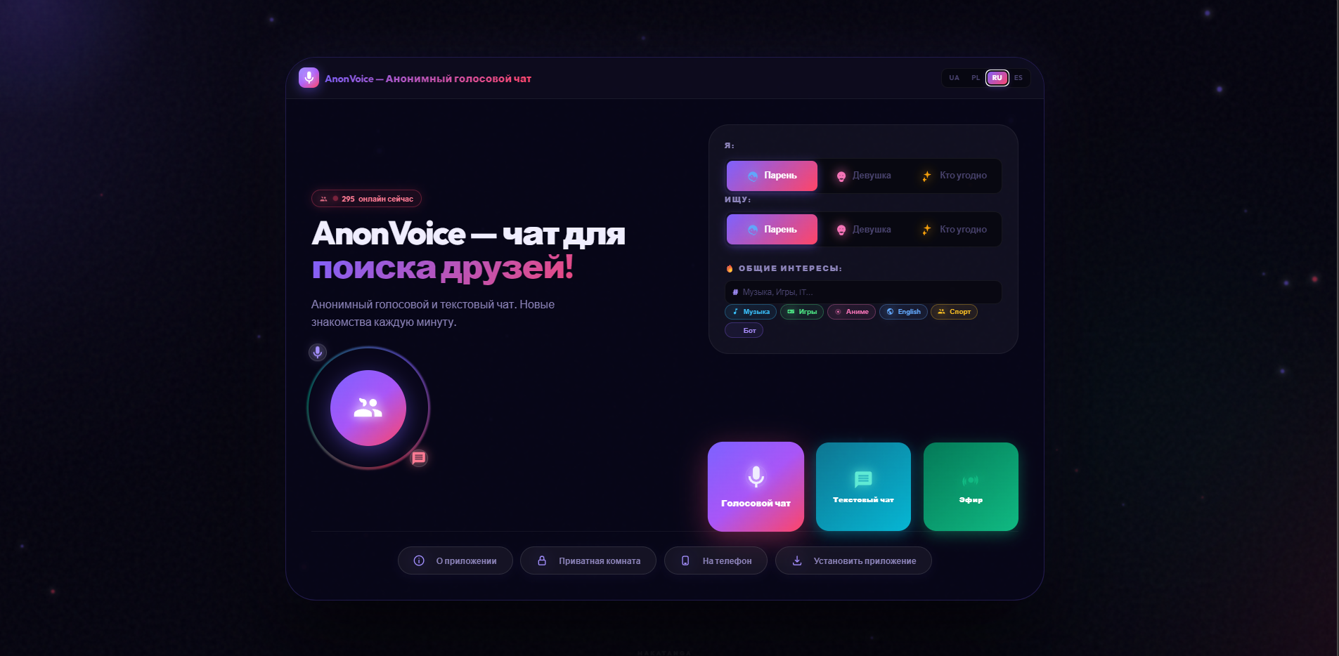 В связи с этим, решил делать новый проект (Анонимный чат + анонимный голосовой чат).