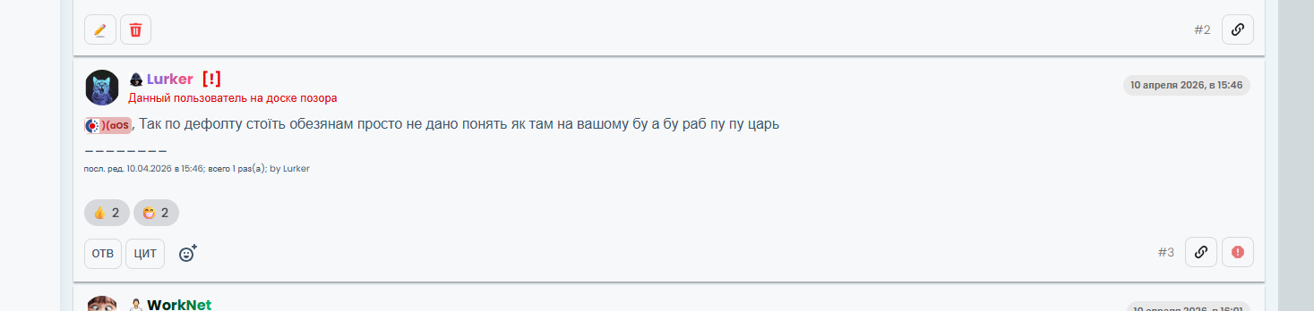 Да ты что? Еще один косяк вышел, тоже игнорит всяких личностей типо Adred. а то что я там обезьяна и прочее, это так норм, ДА? И почему то ни одна жопа ваша не встала и не произвела действий. Пускай я вам не нравлюсь. но правила то для всех. А теперь вопрос, почему я недоволен? Жду ответ и действия. устал тыкать как котят в лоток, модерация тоже мне...Вы еще в авито не работали в модерации. Вот где вам опыта надо набираться, вас бы там по сусекам разнесли за такую модерацию.