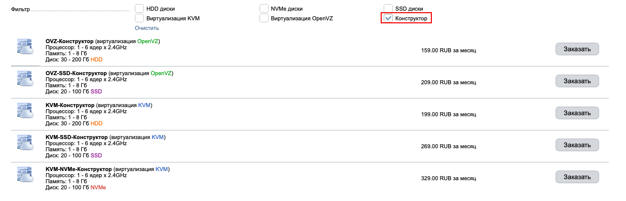 Выберите фильтр "Конструктор" при заказе виртуального сервера и соберите свой тариф: